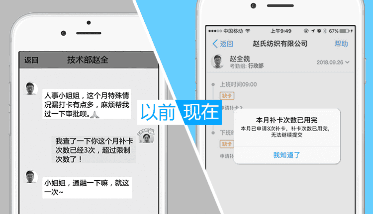 以前:公司限制考勤补卡次数,员工补卡需和人事说明,人事记录汇总.出现补卡过多人事需和员工二次沟通,常碍于情面难处理