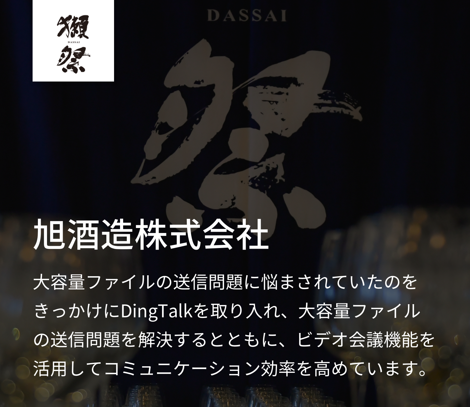 旭酒造:DingTalkは大容量ファイルでも簡単、迅速に送信できることです。ファイルを特定のウェブ転送サイトにアップロードした上で、相手方に受け取るよう通知する必要がありません。これでかなり時間短縮になりました。